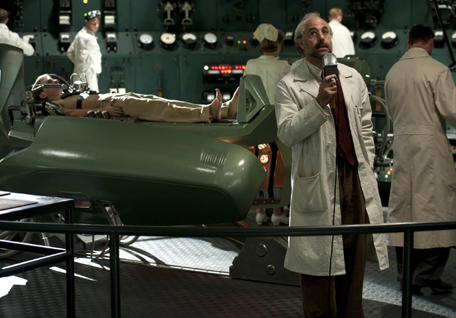 Tras un encuentro con un cientÃfico, el Dr. Abraham Erskine (Stanley Tucci), quien descubre los valores morales del muchacho, Rogers finalmente es aceptado, pero para ser el primer sujeto de prueba de un programa experimental, llamado Renacimiento, en el que recibe dosis de un suero que lo termina convirtiendo en el musculoso super soldado que todos conocemos.