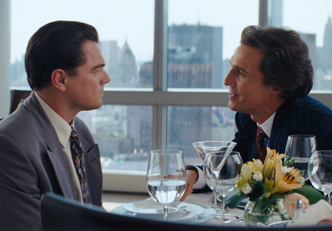 Desde el comienzo mismo, el film nos muestra el vertiginoso ascenso de un joven Belfort (Leonardo DiCaprio), quien a mediados de los ’80 comienza a trabajar para un desquiciado corredor bursátil llamado Mark Hanna (en una breve pero genial interpretación a cargo de Matthew McConaughey), la persona que lo introduce en un mundo lleno de excesos.