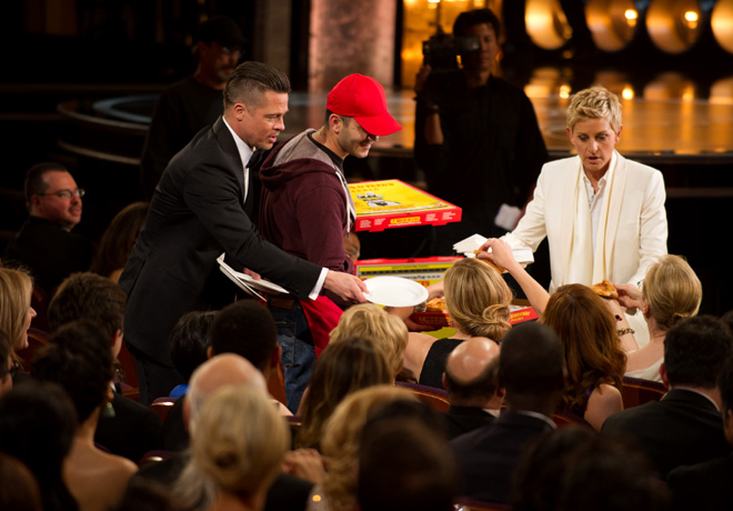 La otra fue cuando sirvió pizza en plena gala, con la ayuda de un verdadero repartidor de una cadena de pizzerías de los Estados Unidos y del propio Brad Pitt, quien repartió los platos de plástico y las servilletas, mientras que la propia Ellen le ofrecía porciones a las estrellas (muchas de ellas hambrientas).