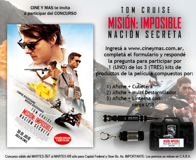 Ethan Hunt y su equipo se enfrentan a su misión más imposible hasta ahora en la quinta entrega de la franquicia que llega el Jueves 30 de Julio. Tenemos 3 kits de productos promocionales. Completá el formulario que se encuentra más abajo y respondé la pregunta.