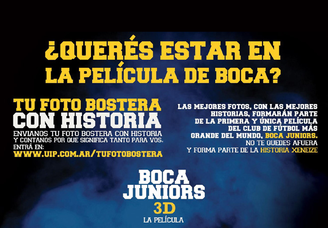 Además, anunció que llevará a cabo una acción para los fanáticos del Club de la Ribera, el primero en el mundo con un film en 3D, puedan estar allà y formar parte de la historia Xeneize. La manera de participar en «Tu Foto Bostera» es enviando una foto, el dÃa Viernes 3 de Julio, a través de la web www.uip.com.ar/tufotobostera