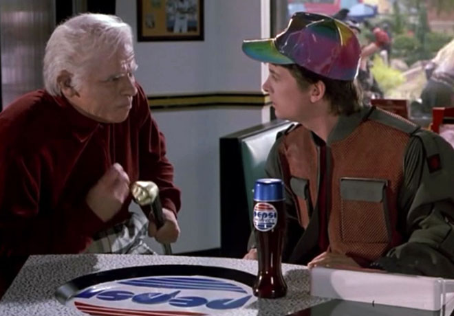 Con motivo de celebrarse el dÃa al que llegan Doc Brown (Christopher Lloyd) y Marty McFly (Michael J. Fox), Miércoles 21 de Octubre de 2015, en la segunda entrega de la franquicia dirigida por Robert Zemeckis, la marca de bebidas cola lanzó una edición limitada de la icónica botella futurista que aparece en una famosa escena del film. Además, la compañÃa realizó una función exclusiva de la pelÃcula.