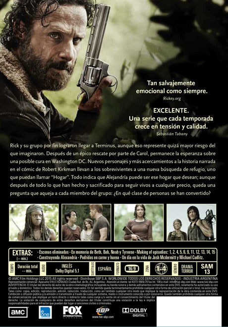Creador: Frank Darabont. Protagonizada por: Andrew Lincoln, Steven Yeun, Chandler Riggs, Norman Reedus, Iron E. Singleton, Melissa McBride, Lauren Cohan, Emily Kinney, Danai Gurira, Scott Wilson, Alanna Masterson, Josh McDermitt, Chad L. Coleman, Sonequa Martin-Green, Lawrence Gilliard Jr, Madison Lintz, Brighton Sharbino, Josh Mcdermitt, Michael Cudlitz y Andrew J. West. Género: Serie de TV / Drama /Terror. Duración: 710 min. Calificación: SAM 16. Disponible en DVD.