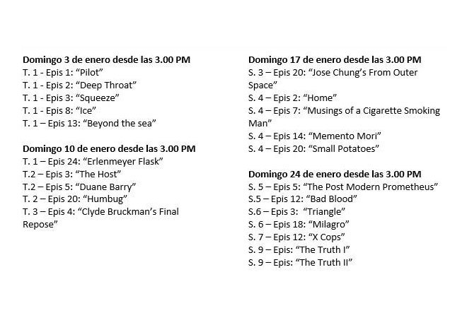 Este especial se emitirá los Domingos 3, 10, 17 y 24 de Enero a partir de las 15:00 hs. con cinco episodios consecutivos, hasta completar los veinte, de los cuales ocho, fueron incluídos en un pack de cuatro DVD’s que se lanzó a la venta en el año 2008 de la mano de la desaparecida videoeditora Gativideo: «Lo Mejor de los Expedientes Secretos X» (The X Files: Essentials).