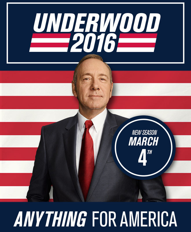 El presidente Frank Underwood anunció su candidatura presidencial para 2016. Con un spot de su campaña, Netflix anunció la fecha de estreno de la cuarta temporada de «House of Cards» mientras se desarrollaba el último Debate del Partido Republicano, enmarcado en la campaña presidencial de los Estados Unidos.