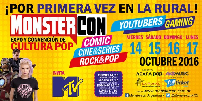 Se viene una nueva edición de MonsterCon, la exposición y convención de cultura pop que se realizará en el Pabellón Ocre del Centro de exposiciones del Predio La Rural de Buenos Aires (Avenida Santa Fe, esquina Avenida Sarmiento), los días Viernes 14, Sábado 15, Domingo 16 (de 14 a 22 hs.) y 17 de Octubre (de 12 a 20 hs.). De la mano de la productora Acara Pop tenemos 2 (DOS) pares de entradas para regalar (UNO para el Viernes y UNO para el Lunes). Completá el formulario que se encuentra más abajo y el JUEVES 13 anunciamos a los GANADORES.