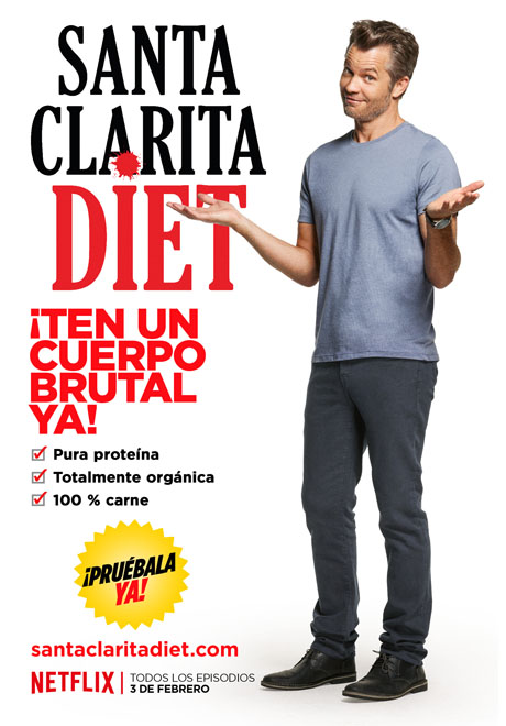 Fíjense que en una foto Sheila está comiendo carne picada cruda y en su afiche promocional tiene en su mano un batido bastante proteico repleto de carne humana (dedos, ojos, etc.). Una excelente campaña de marketing para esta «dieta» por la que muchos ¿morirían? y así lograr un cuerpo perfecto…