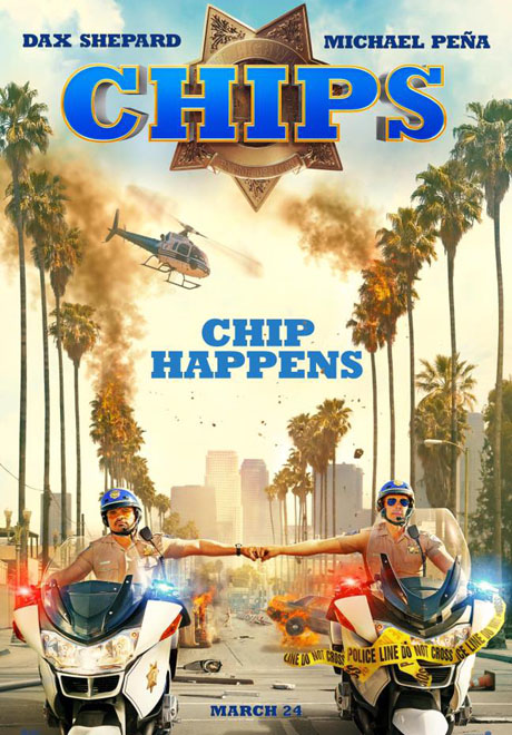Warner Bros. Pictures lanzó el primer trailer de «Chips: Patrulla Motorizada Recargada» (CHiPs), la adaptación cinematográfica de la exitosa serie de los 70. Junto con el afiche, se confirmó que la comedia escrita, dirigida y protagonizada por Dax Shepard, se estrenará el próximo 23 de Marzo en la Argentina (24 en los Estados Unidos). Veremos cuál es la fecha elegida por la distribuidora en la Argentina.