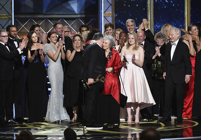 Por su parte, la serie creada por el productor Bruce Miller (premiado al Mejor Guión de una Serie de Drama) y que transcurre en un futuro distópico sobre una sociedad en la que las mujeres son obligadas a la esclavitud sexual, se ha convertido en la primera serie que se transmite por streaming en llevarse el premio al mejor drama. Además, su protagonista principal, Elisabeth Moss, se llevó el premio como Mejor Actriz mientras que su compañera Ann Dowd fue reconocida como Mejor Actriz de Reparto. Reed Morano fue la Mejor Directora en una Serie de Drama.