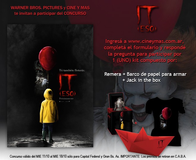 El 21 de Septiembre se estrenó en la Argentina la adaptación cinematográfica de la novela de terror Stephen King. De la mano de Warner Bros. Pictures regalamos un kit de la película. Completá el formulario que se encuentra más abajo y seguinos en twitter.com/cineymas.