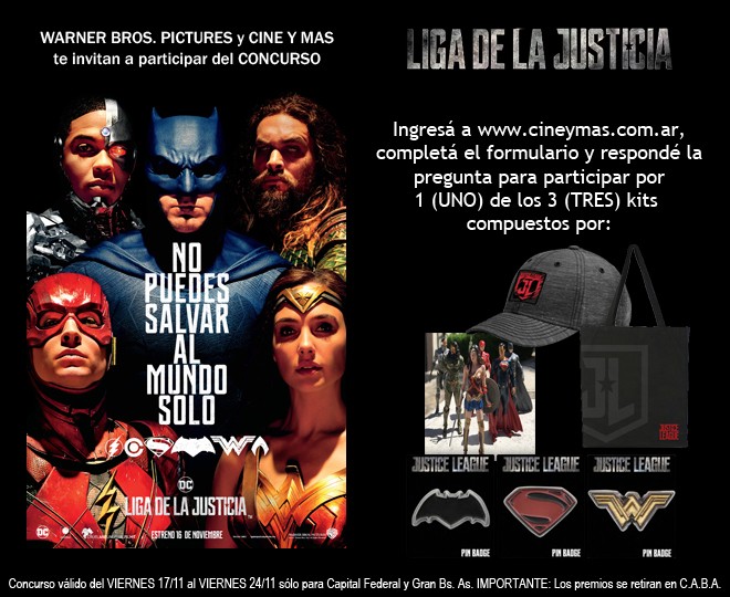 Con motivo del estreno del film que reúne a los superhéroes de DC Comics, sorteamos tres kits con productos promocionales, gentileza de Warner Bros. Pictures. Completá el formulario que se encuentra más abajo, respondé la pregunta. Seguinos en Facebook.com/cineymas y twitter.com/cineymas.