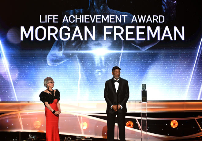 El reconocimiento a la trayectoria fue para Morgan Fremman, quien subió muy canchero al escenario, vestido de esmoquin y gorrita. Éste fue su momento: