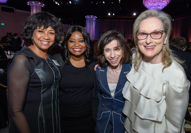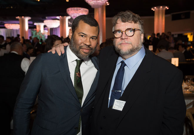 - Sexta Fila (Izq. a Der.): Alexandre Desplat, Mary J Blige, Amy Pascal, Gary Fettis, Octavia Spencer, Guillermo del Toro, Ben Morris, Aaron Sorkin, Kristie Macosko Krieger, Jeff Melvin, Hoyt van Hoytema, Andrey Zvyagintsev, Sarah Greenwood, Jason Blum, Chris Nolan, Sam Rockwell, Emma Thomas, Steve James, Joe Letteri, Carlos Saldanha, Meryl Streep, Greta Gerwig, Agnès Varda (cutout), JR, Tatiana S.Riegel, Steven Spielberg, Luca Guadagnino, Ramsey Naito, Julian Slater, Lonnie Lynn, Ron Bartlett, Pete Czernin, y Theo Green.