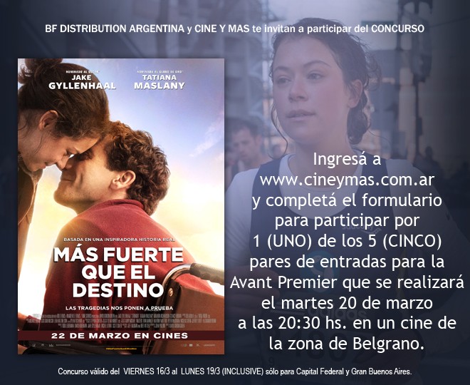 Junto a BF Distribution Argentina te invitamos a la Avant Premier de «Más Fuerte que el Destino» (Stronger), película que cuenta la historia de Jeff Bauman, un joven que perdió sus dos piernas como consecuencia del atentado en el Maratón de Boston, ocurrido en 2013. Completá el formulario que se encuentra más abajo y participá por uno de los cinco pares de entradas. Además, seguinos en nuestras redes: