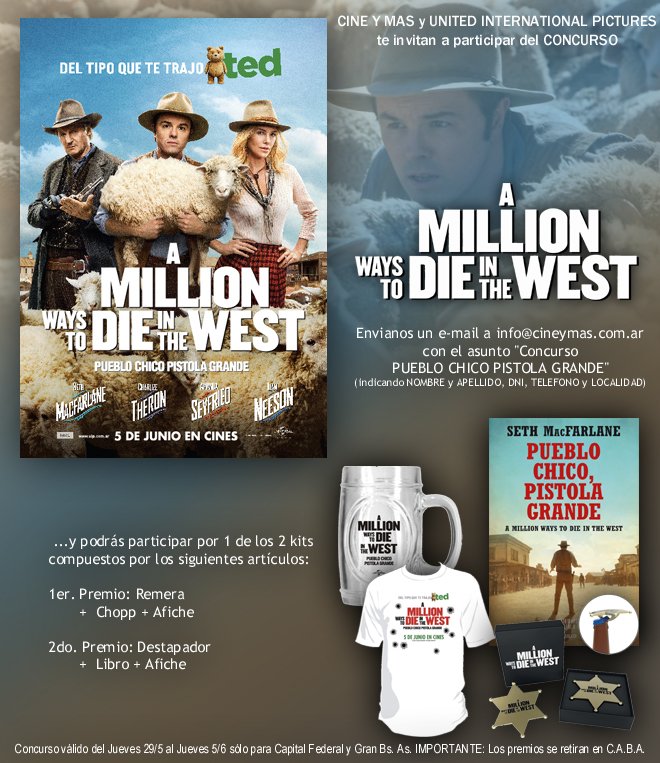 Este Jueves 5 de Junio llega el divertido nuevo delirio del Sr. Seth MacFarlane, el creador de “Padre de Familia” y “American Dad” que en 2012 debutó como director cinematográfico con la exitosa comedia “Ted”. Se trata de "A Million Ways to Die in the West" (Pueblo Chico, Pistola Grande). Junto a United International Pictures, te invitamos a participar de este concurso por uno de los dos kits que tenemos para vos. Sigue leyendo