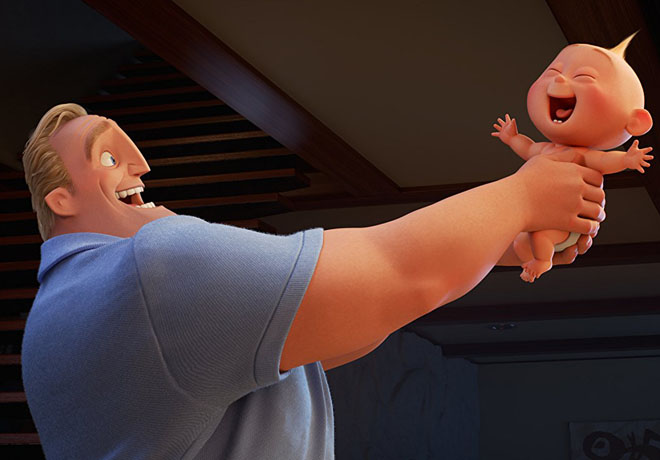 En esta segunda entrega, Bob Parr queda a cargo del bebé Jack-Jack mientras Helen es quien se encuentra salvando el mundo.
