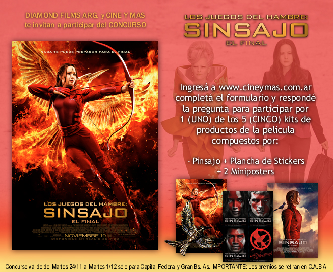 Katniss Everdeen se despide de la pantalla grande en la última entrega de la franquicia basada en la saga literaria escrita por Suzanne Collins. Con motivo del estreno de "Los Juegos del Hambre: Sinsajo - El Final", sorteamos productos promocionales gentileza de Diamond Films Arg. Sigue leyendo